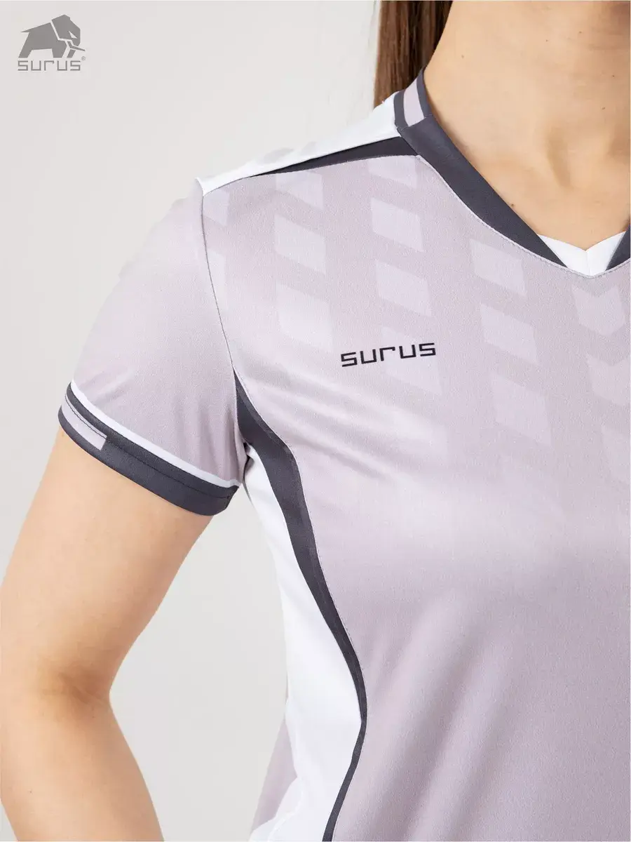 Футболка женская спортивная бренда Surus с коротким рукавов, цвет серый, идеально подходит для занятий волейболом, фитнесом, бегом, легкой атлетикой (так же хорошо подходит для занятий большим и настольным теннисом). Посадка изделия разработана с учетом специфики ее применения в данных видах спорта и не сковывает движения при активных занятиях во время игр и тренировок в тренажерном зале и на открытом воздухе.